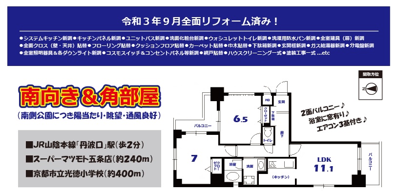 フォルム五条通り ★令和3年9月全面リフォーム済み★南西角部屋&南向き 2,780 万円 所在地:京都市下京区中堂寺坊城町 交通:JR「丹波口」駅歩2分 構造:11階建4階部分 号数:401号室 専有面積:56.87㎡ バルコニー:9.30㎡ 間取り:2LDK 管理費:9090円/月 修繕積立金:10800円/月 建築年月:平成4年1月 現況:空室 明け渡し:即時 総戸数:98戸 管理形態:委託管理 学区:光徳小学校/松原中学校 備考:自治会費100円/月 この物件のお問い合せ この物件のお問い合せを希望の方は、下の送信フォームに必要事項をご入力の上、送信をお願いいたします。後ほど担当者よりご連絡差し上げますので、お気軽に何なりとご相談ください。 物件名: 『フォルム五条通り』 お名前 [必須] フリガナ [必須] メールアドレス [必須] お電話番号 お問い合わせ内容